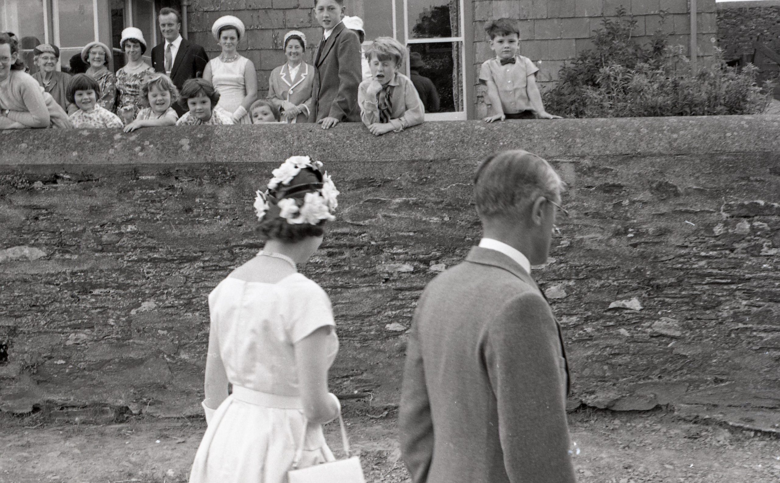 Queen Elizabeth II and Prince Philip walking past onlookers of children,