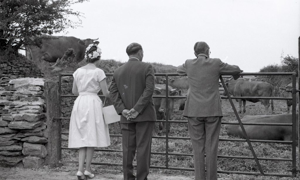 Queen Elizabeth II and Prince Philip on a farm,