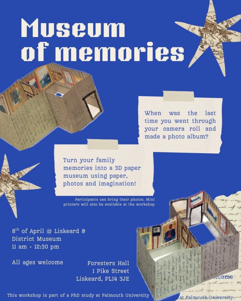 Join PHD student Lana and create your own 3D museum of memories using paper, photos and your imagination. Participants can bring their own photos although Lana will have printing facilities available.